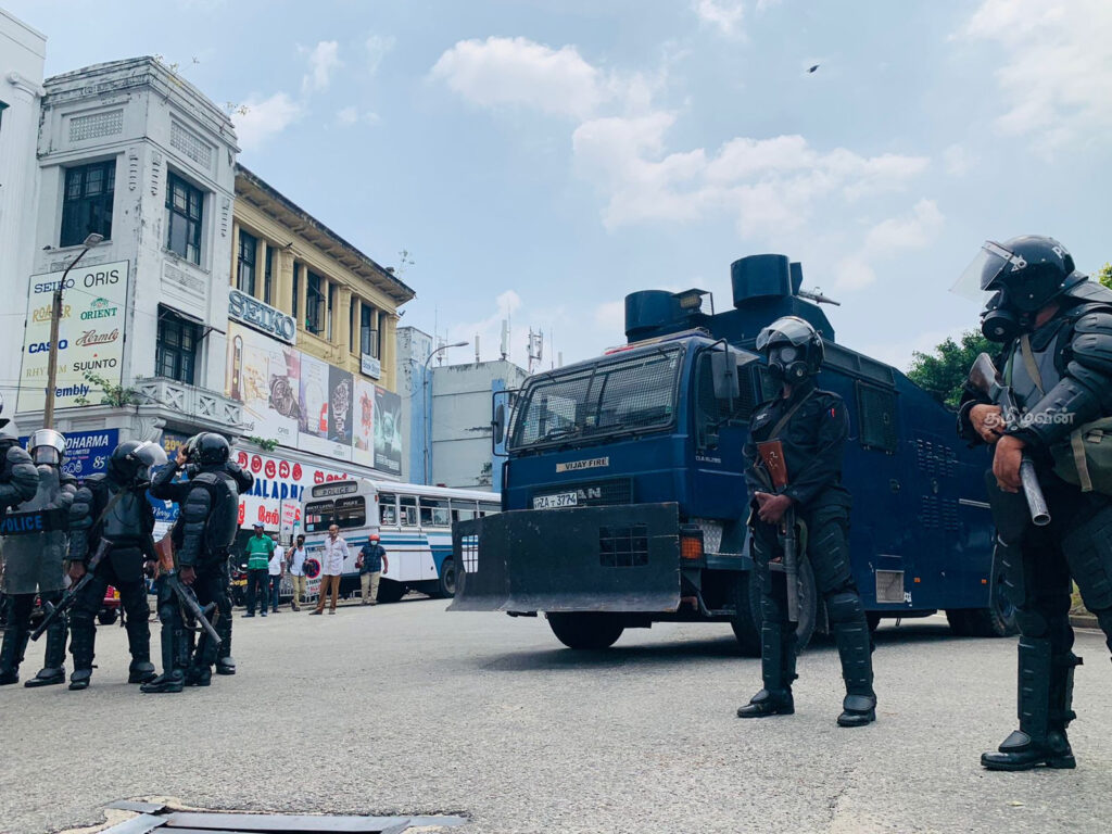 ஆர்ப்பாட்டத்தின் போது பெருமளவிலான பொலிஸார் கடமைகளுக்காக ஈடுப்படுத்தப்பட்டுள்ள நிலையில் நீர்த்தாரை பிரயோக வண்டியும் கொண்டுவரப்பட்டுள்ளமை குறிப்பிடத்தக்கது.