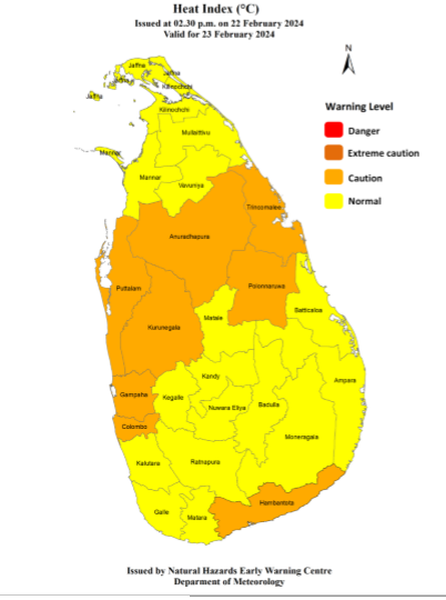 மதியம் 02.30 மணிக்கு இயற்கை அபாயங்கள் முன்னெச்சரிக்கை மையத்தால் வழங்கப்படும் வெப்ப குறியீட்டு ஆலோசனை 22 பிப்ரவரி 2024, 23 பிப்ரவரி 2024 வரை செல்லுபடியாகும்