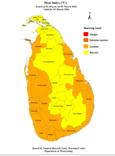 பிற்பகல் 03.30 மணிக்கு இயற்கை அபாயங்கள் ஆரம்ப எச்சரிக்கை மையத்தால் வெப்ப குறியீட்டு ஆலோசனை வழங்கப்படுகிறது. 02 மார்ச் 2024, 03 மார்ச் 2024 வரை செல்லுபடியாகும்