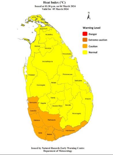 பிற்பகல் 03.30 மணிக்கு இயற்கை அபாயங்கள் முன்னெச்சரிக்கை மையத்தால் வெளியிடப்பட்ட வெப்ப குறியீட்டு ஆலோசனை 04 மார்ச் 2024, 05 மார்ச் 2024 வரை செல்லுபடியாகும்