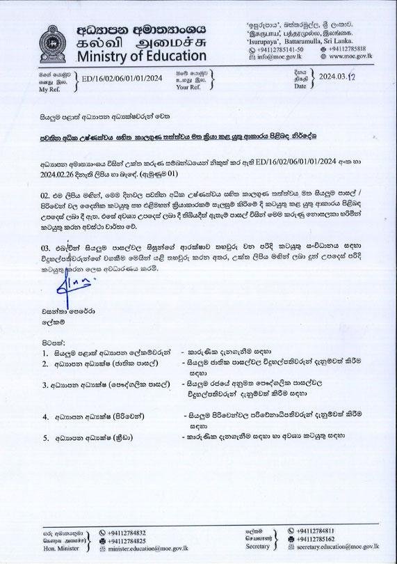 இந்த நாட்களில் நிலவும் அதிக வெப்பநிலையின் அடிப்படையில் அனைத்து பாடசாலைகள் மற்றும் பிரிவேனாக்களின் அன்றாட நடவடிக்கைகள் மற்றும் வெளிப்புற நடவடிக்கைகளை எவ்வாறு திட்டமிடுவது என்பது குறித்த அறிவுறுத்தல்கள் கடிதத்தில் வழங்கப்பட்டுள்ளன.